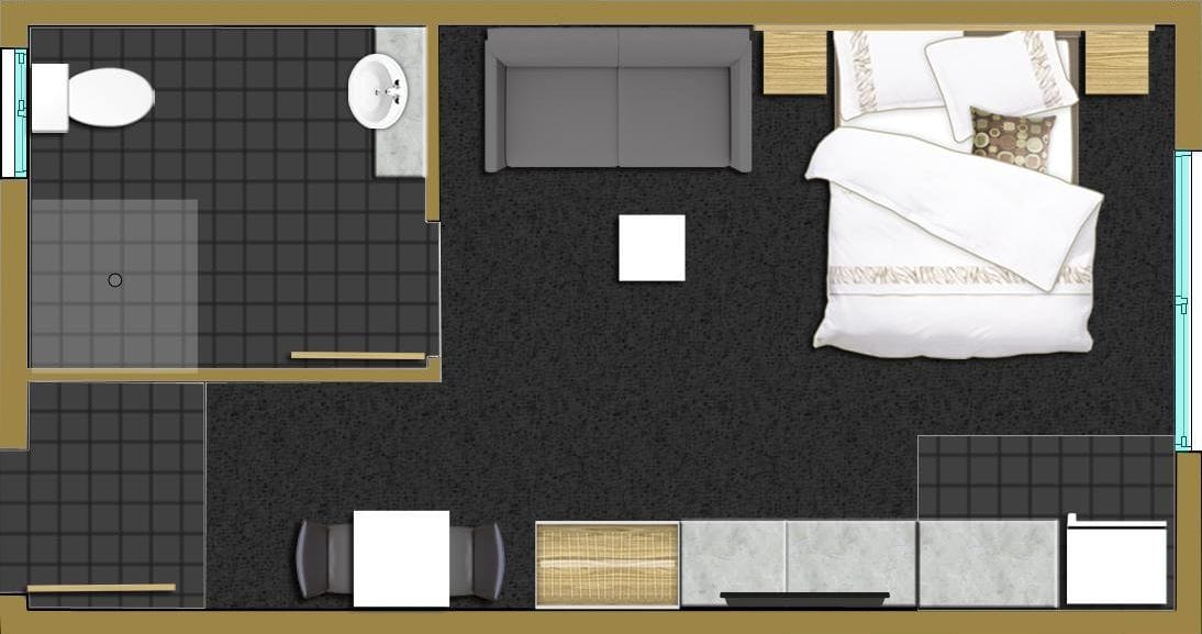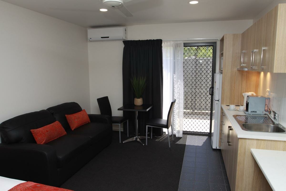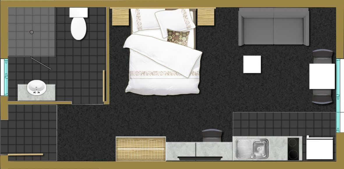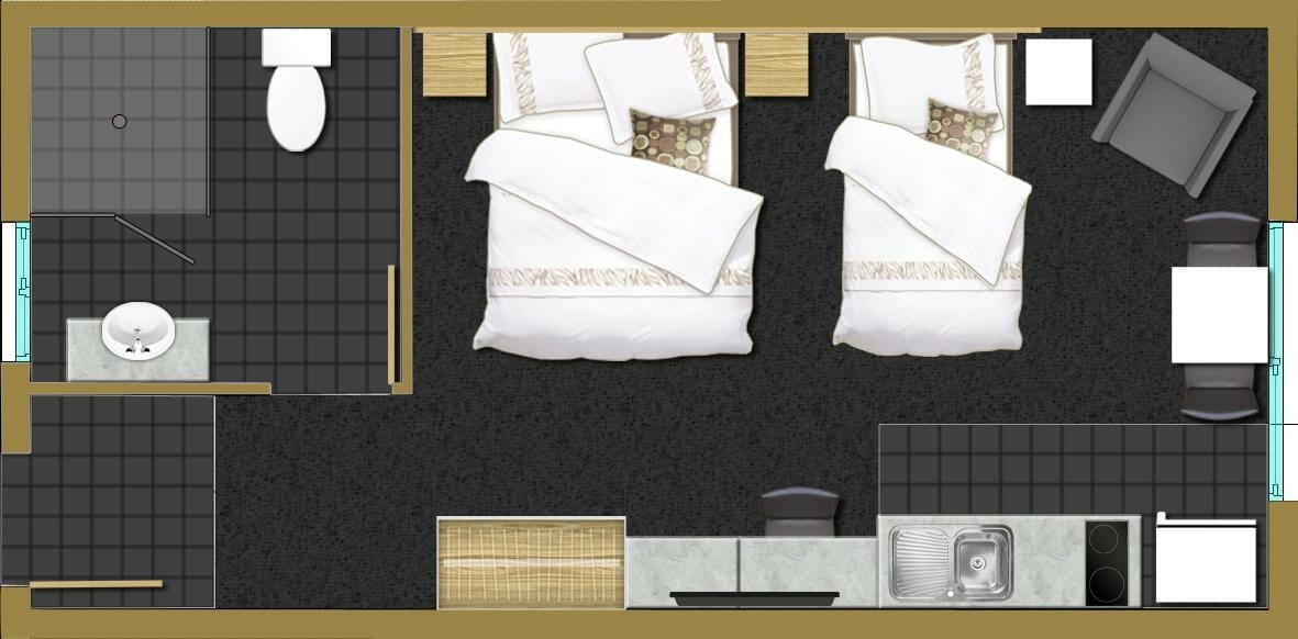 This Twin Studio Kitchenette sleeps 1-3 people. Bedding includes 1 Queen bed & 1 King Single bed.